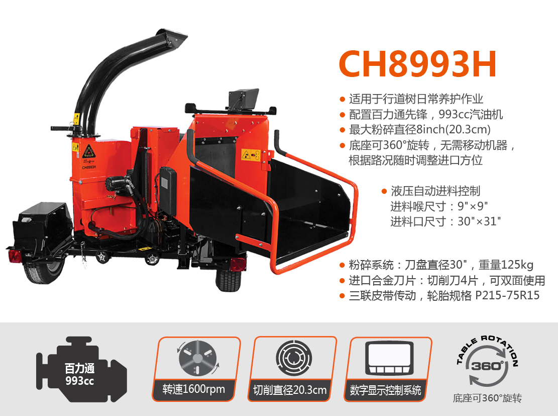 老熊(BEARCAT)品牌樹枝粉碎機(jī),配置百力通先鋒993cc發(fā)動(dòng)機(jī),最大可切削直徑20cm樹枝。